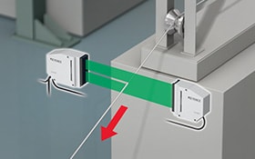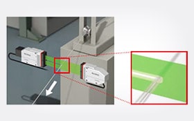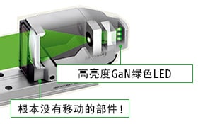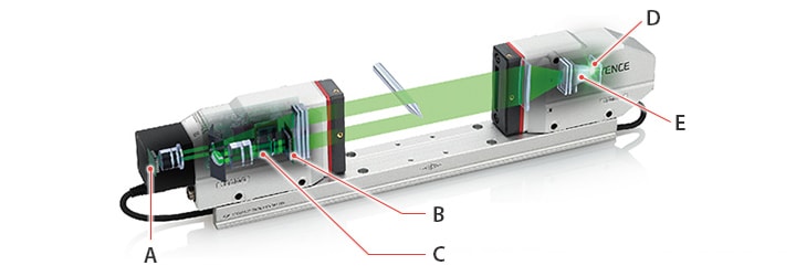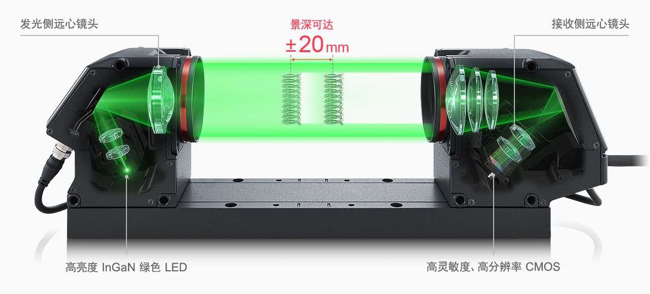 綠色LED光以均勻的準直光束發射。當目標物體遮斷該光束時,會在受光元件上形成陰影,測量該陰影即可準確反映目標物體的尺寸。