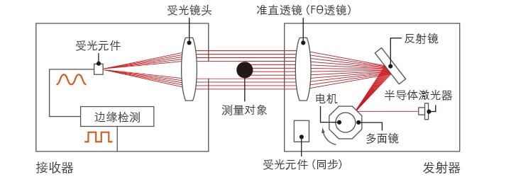 激光照射到旋轉的多面體反射鏡上,光束以固定速度在傳感器的測量范圍內掃描。通過測量光被接收器遮擋的時間來確定外徑等參數。