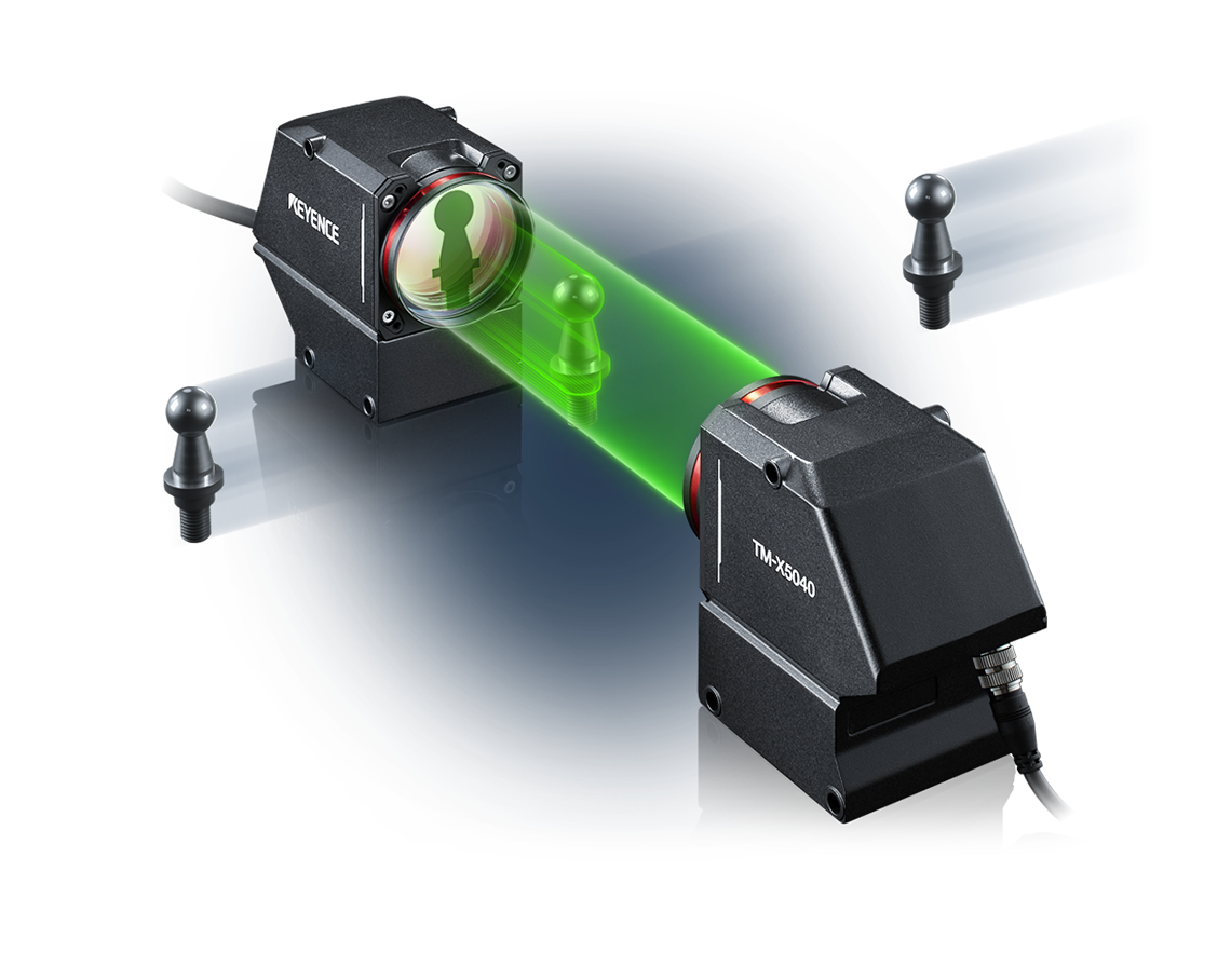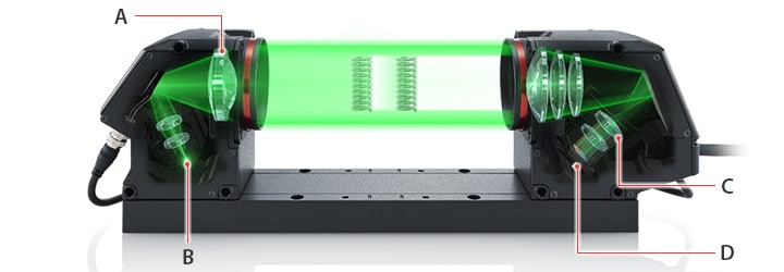 發射器通過綠色LED發出準直光,在接收器的CMOS傳感器上投射出陰影。測量通過捕捉到的圖像進行。TM-X5000 系列在發射器和接收器中都配備了遠心鏡頭,助力實現穩定且高精度的測量。