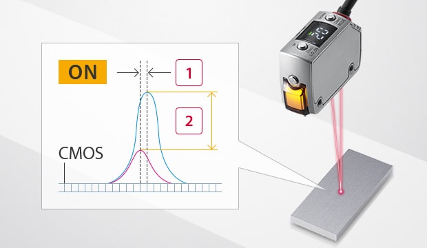 存儲到基準背景的距離和光強度,工件在進入檢測區域時,如果距離或光強度從存儲的狀態開始發生變化,則會進行檢測。如果存在背景,即使形狀復雜、工件的顏色或表面狀態發生變化仍可進行準確檢測,即使是段差較小的薄型工件也可進行穩定檢測。