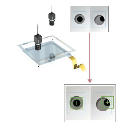 對于玻璃面板,要求得到高精度的位置信息。而對于IC 檢查,則要求具有適用于高速生產線的處理能力。除此之外,在對于前兩講中曾經介紹過的“瑕疵”、“邊緣”等進行檢查之前,需要對齊工件的位置。因此,“位置補正功能”也是必不可少的。