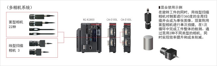 傳統(tǒng)的視覺系統(tǒng)不支持視覺系統(tǒng)的混合使用。基恩士的XG-X系列提供24種面型相機(jī)、6種線型掃描相機(jī)和4種3D相機(jī),最多可支持4種相機(jī)的混合使用。例如在檢測(cè)圓柱形工件時(shí),可以利用線型掃描相機(jī),對(duì)側(cè)面進(jìn)行360度的全周掃描并顯示為單張圖像,再用面型相機(jī)拍攝端面。像這樣,通過搭配使用不同的視覺系統(tǒng),可以同時(shí)實(shí)現(xiàn)效率提升和成本削減。*