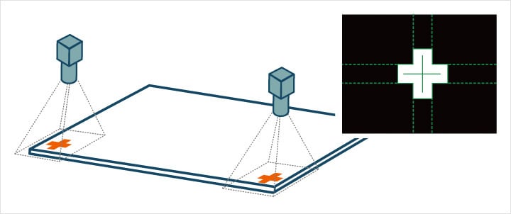 圖形搜索(搜索處理),是利用視覺系統(tǒng)進行定位/對準時的必需技術。圖形搜索中,會自動檢測作為基準的圖像及圖形(標記),該標記也被稱為“對準標記”、“定位標記”。此時,利用鏡頭失真補正及濾波器功能,能夠實現(xiàn)高精度的位置檢測。