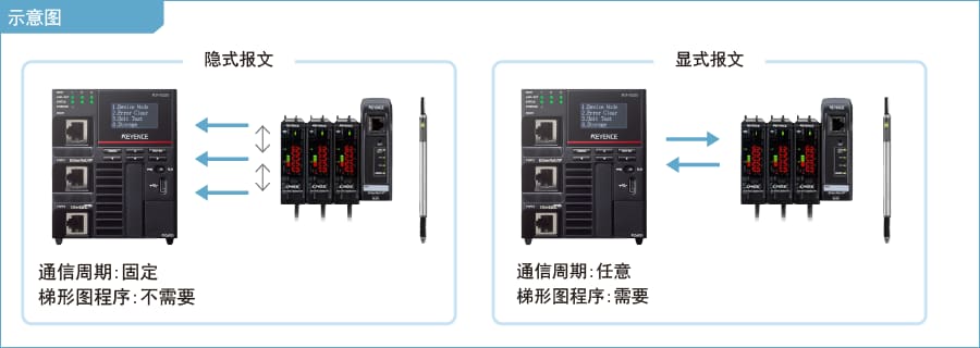 DL-EP1 通過 EtherNet/IP? 通信將數(shù)據(jù)傳輸至 PLC。支持 2 種通信方法,分別是以固定周期進行通信的隱式報文和在任意時間進行通信的顯式報文。