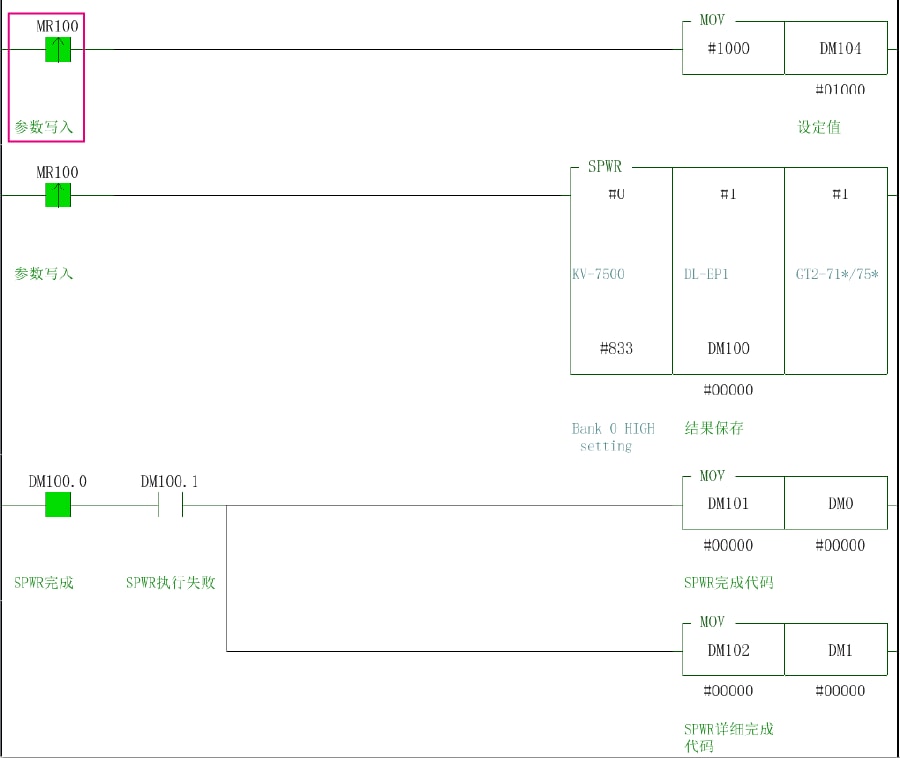 ? 將希望寫入的值(#1000)存儲至設(shè)定值(DM104)。 ? 在 KV 系列(單元編號:#0)、節(jié)點 1 的 DL-EP1(節(jié)點地址:#1)、插槽 1 的 GT2-71N(插槽編號:#1)、HI 設(shè)定值(參數(shù)編號:#833)中寫入設(shè)定值(#1000)。 ? SPWR 指令(寫入傳感器參數(shù)指令)執(zhí)行失敗時,將完成代碼和詳細完成代碼存儲至DM0、DM1。
