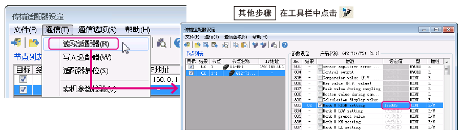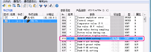 ?直接確認 GT2-71N 的傳感器放大器。 ?通過 KV STUDIO 的傳輸適配器設(shè)定讀取“通道 0 的 HIGH 側(cè)設(shè)定值”。
