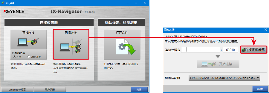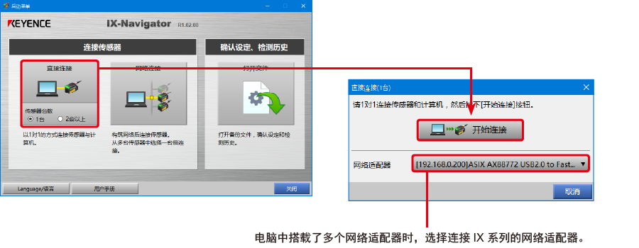 使用 IX-Navigator,進(jìn)行 IX 系列的設(shè)定。下面以使用 LAN 電纜將電腦與 IX 系列進(jìn)行 1 : 1 連接,自動設(shè)定 IP 地址進(jìn)行連接時(shí)為例進(jìn)行說明。指定 IP 地址連接時(shí),請參閱要點(diǎn)。