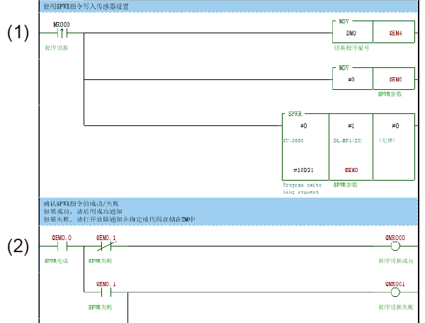 (1) 在 MR000 的上升沿,將 IX 系列的程序編號切換為 DM0 中存儲值的編號。 (2) 切換成功后,將 @MR000 置于 ON。如果切換失敗,將 @MR001 置于 ON,將完成代碼和詳細(xì)完成代碼分別存儲到 DM1 與 DM2。