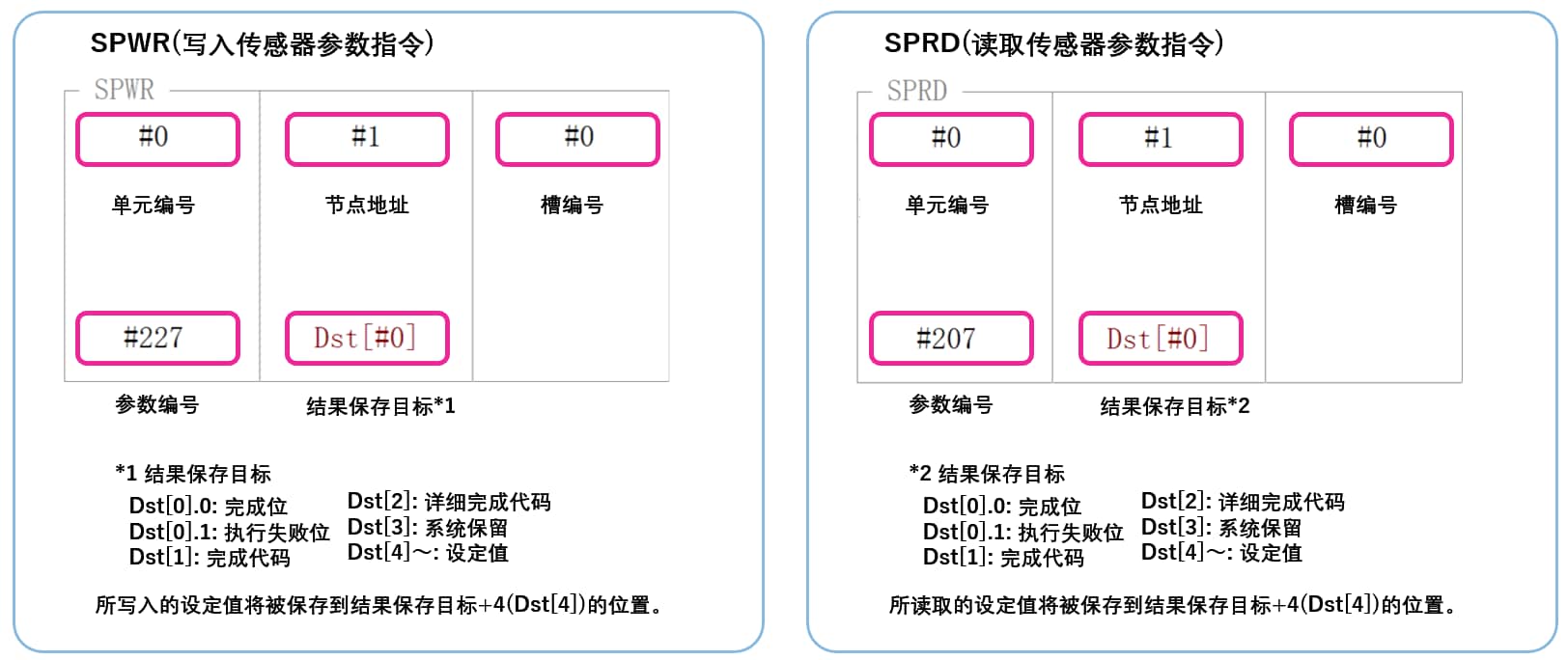 執(zhí)行 SPWR(傳感器參數(shù)寫入指令)、SPRD(傳感器參數(shù)讀取指令)時(shí),寫入 / 讀取指定傳感器的參數(shù)。