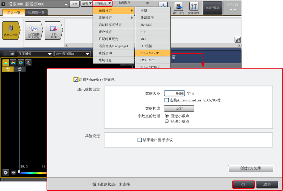 4.顯示[EtherNet/IP設(shè)置]窗口,選擇【EDS文件(D)】→【注冊(cè)(I)】,導(dǎo)入基恩士公司制傳感器設(shè)置文件(ez1文件)。