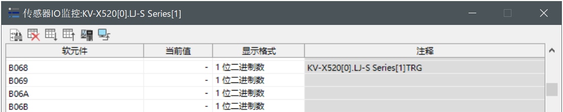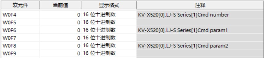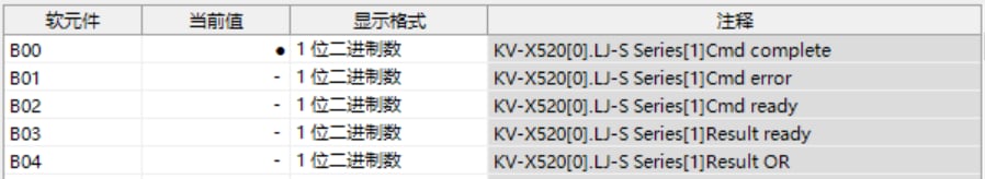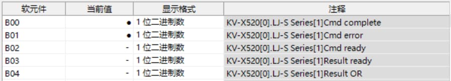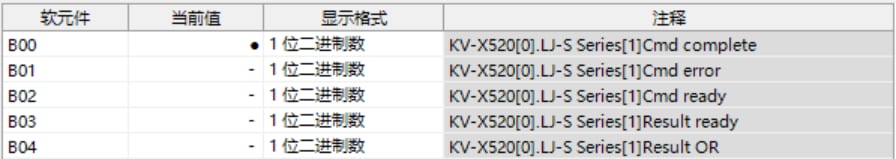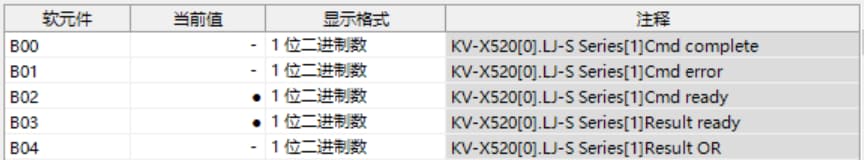 表中的B****/W**** 是僅1臺(tái)LJ-S8000系列作為EtherNet/IP 設(shè)備連接到KV-X 系列CPU 單元時(shí)的鏈路繼電器、鏈路寄存器地址分配示例。分別記載著以下情況的軟元件映射。