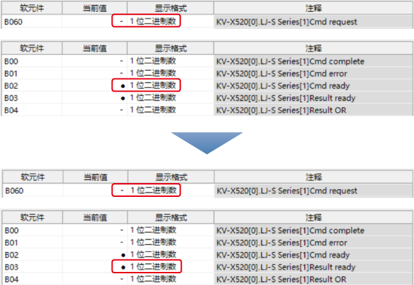 確認(rèn)Command complete(B000)、Command error(B001) 及Command result(W004) 的值的變化。