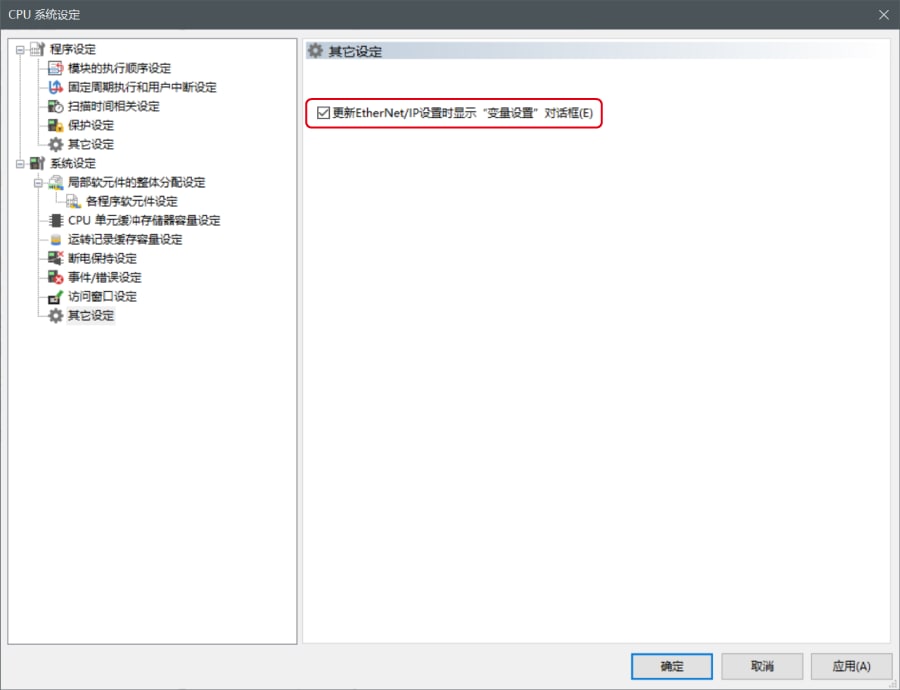 給EtherNet/IP的連接分配變量時(shí),在[CPU系統(tǒng)設(shè)定]對(duì)話框的“系統(tǒng)設(shè)定”的“其他設(shè)定”中勾選“EtherNet/IP設(shè)置更新時(shí)顯示變量設(shè)置對(duì)話框(E)”。