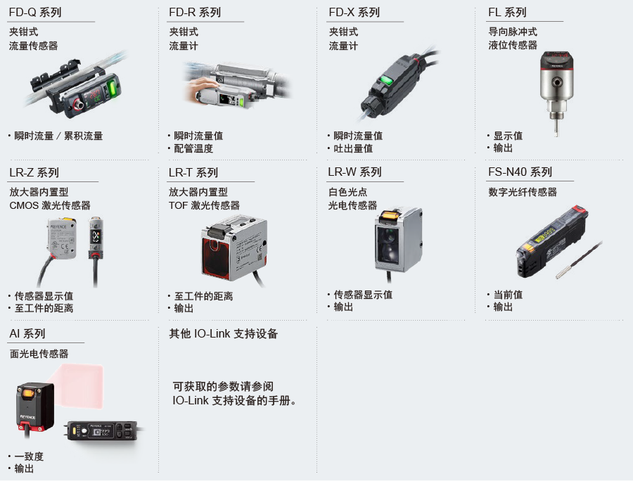 可連接到 NQ 系列的 IO-Link 設備以及可獲取的參數的典型例如下所示。 * 可獲取的參數因流程數據格式而異。