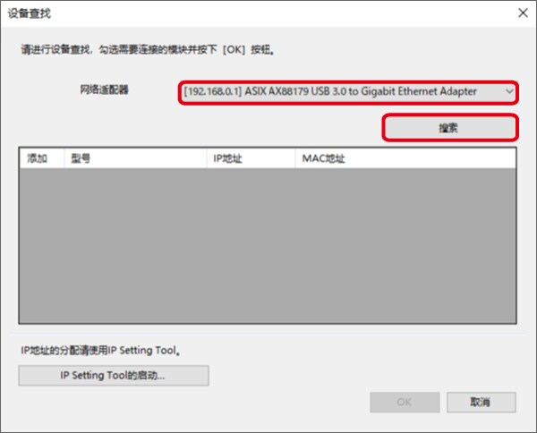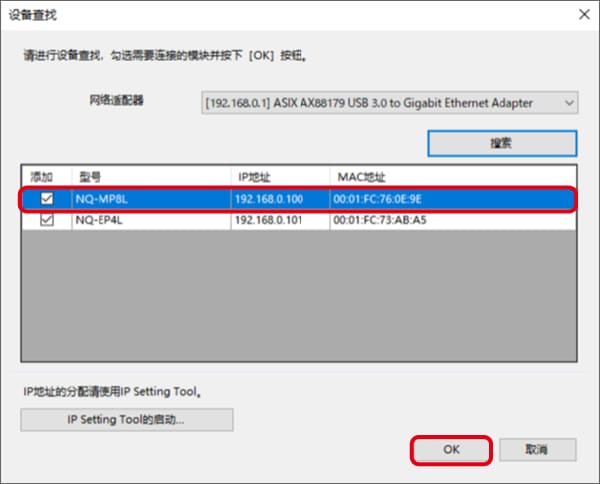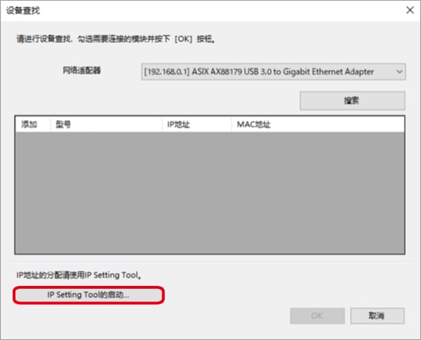 * 如果 PC 上沒有安裝 IP Setting Tool,首次啟動時會顯示安裝向導,請按照向導安裝 IP Setting Tool。 * 如果已經為 NQ 系列設定了 IP 地址,請在不啟動 IP Setting Tool 的情況下前進至步驟 6。